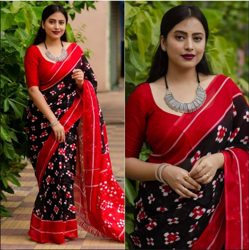 Black and Red Color Digital Printed Cotton Linen Saree With Blouse Piece